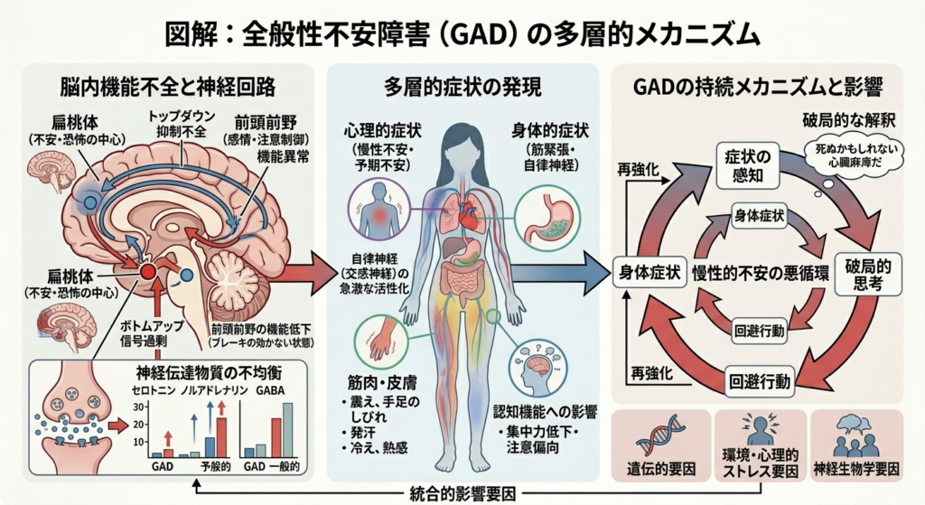 脳の扁桃体や前頭前野の機能異常により、不安を適切にコントロールできなくなります。常に「危険を察知するモード」が働き続けている状態です。