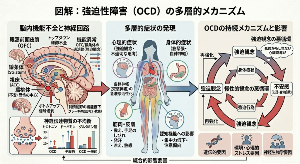 脳の特定の部位(前頭前野、基底核など)の機能異常により、不安を適切にコントロールできなくなります。強迫観念が生じると、それを打ち消すために強迫行為を繰り返すという悪循環に陥ります。